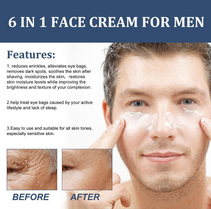 Men's 6-in-1 face cream: 6-in-1 men's skin cream can reduce wrinkles, black spots, relieve eye bags, relieve skin and moisturize skin after shaving. This men's facial moisturizing cream can restore the skin moisture level and improve the brightness and texture of the skin tone.