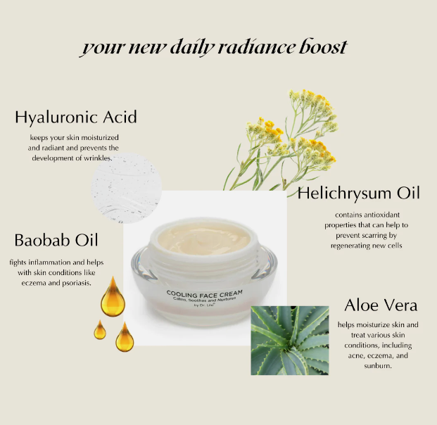 The Face Cream is gluten-free, hypoallergenic, cooling, calming, and nurturing. It will make your skin clearer, more radiant, and younger-looking.