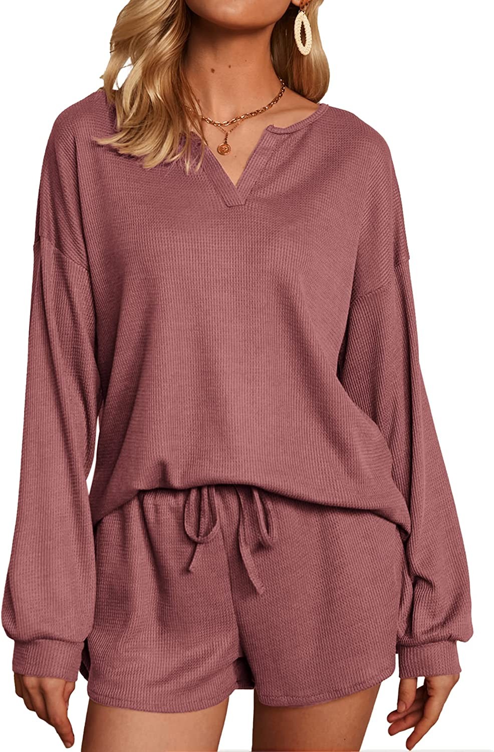 Ekouaer Pajamas Womens Waffle Knit Lounge Set Long Sleeve Top and Shorts 2 Piece