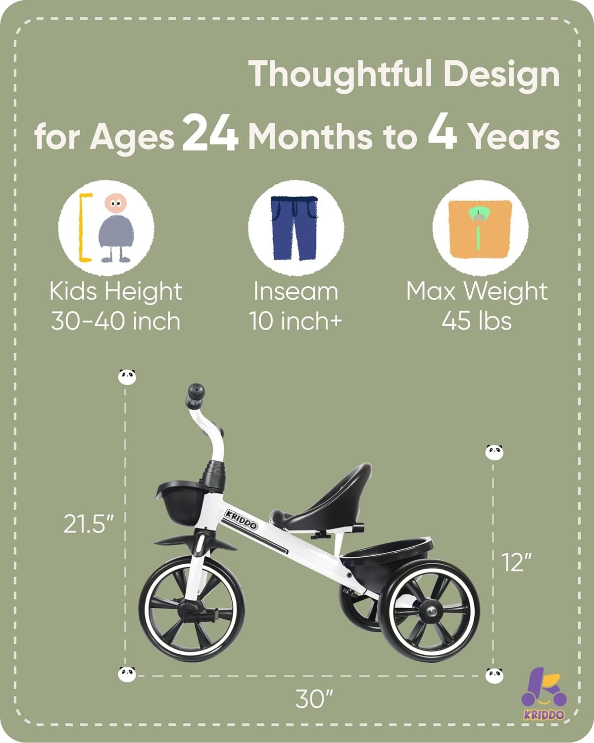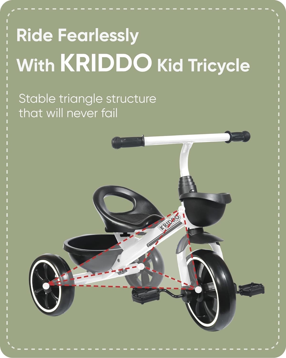 • TODDLER TRICYCLE – KRIDDO kids tricycle is designed for 24-48 month toddler girls & boys who are curious and exited to explore the world, it helps to develop kids' steering skills, steering and coordination at an early age. KRIDDO kids trike for 2 year old let your kids enjoy riding and gain confidence, as well as develop muscle strength, it’s a fun gift for your little ones.