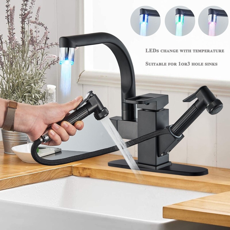 LED Kitchen Sink Faucet Matte Black Single Handle Pull Down Sprayer with Cover