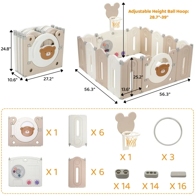 【Educational Toys Panel】The gate panel of playpen is designed to stimulate your child's development and creativity. With rotating wheels, a ball hoop, 3 rings and a digital table, it offers a range of activities that enhance hand-eye coordination, promote bone development, and cognitive skills.