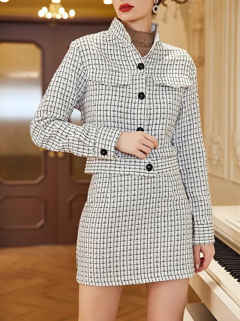 Plaid Button Textured Blazer, Open Front Long Sleeve Suit Jacket With Wide Lapels, Elegant & Stylish Tops For Office & Work, Women's Clothing & Outerwear
