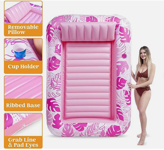 INCLUDES. Packaged includes one 85” x 57” extra large inflatable suntan pool float featured with Inflatable base for extra comfort, two 3”drink holders, one removable headrest, wrap around rope