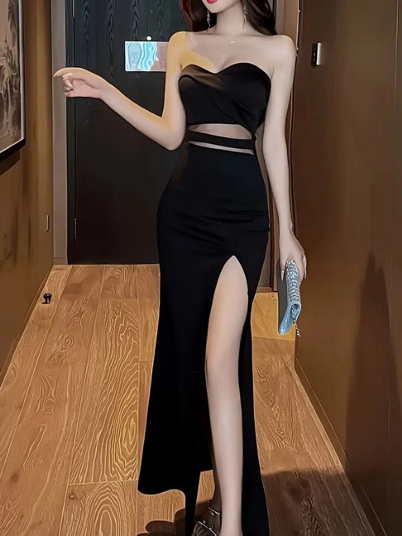 Solid Cut Out Split Thigh Tube Dress, Elegant Sleeveless Strapless Bodycon Dress, Women's Clothing