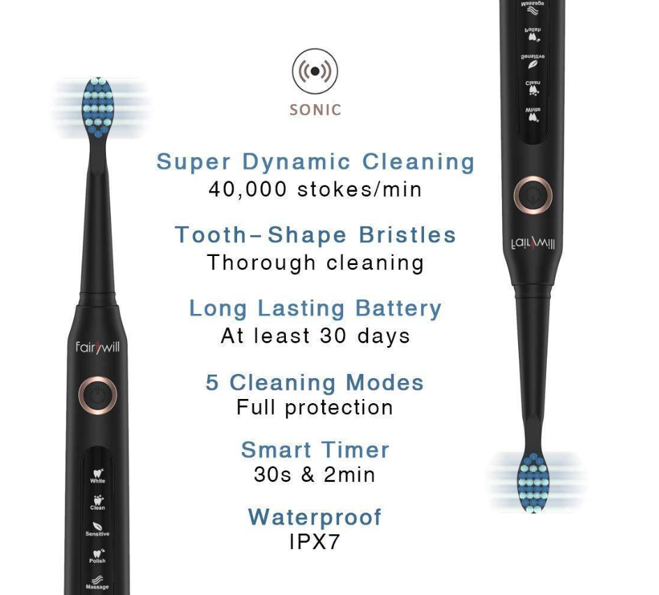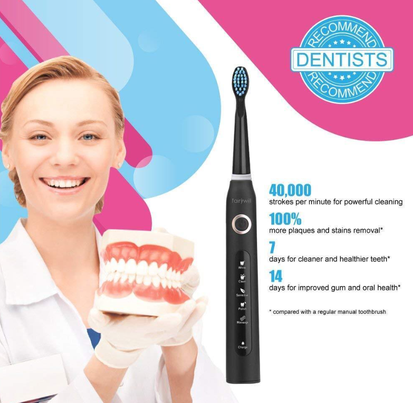 • POWERFUL CLEANING AS JUST GET OFF DENTIST'S CHAIR. This electric toothbrush with 40,000 micro-brush per minute. Remove up to 100% more plaques and stains, compared with a regular manual toothbrush. Enjoy clean and healthy teeth in 7 days and improve gum and oral health in 14 days. 5 YEARS LIFE DESIGN WITH 1 YEAR WARRANTY AND 180 DAYS NO HASSLE RETURN.