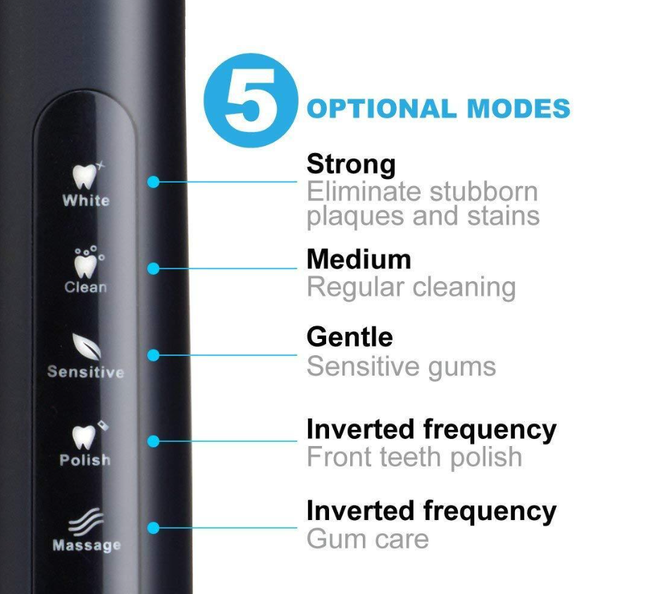 • 5 MODES OF WHITE, CLEAN(DAILY USE), SENSITIVE(GENTLE VIBRATION FOR KIDS/CHILDREN), POLISH, MASSAGE(GUM CARE) to suit different conditions of teeth and gums. 55 gram extra-light weight designed, less than half of regular electric toothbrush. Light in hand but thorough cleaning with reduced noise, upgraded brushing experience than a regular electric toothbrush. 3 replacement heads and a travel case included.